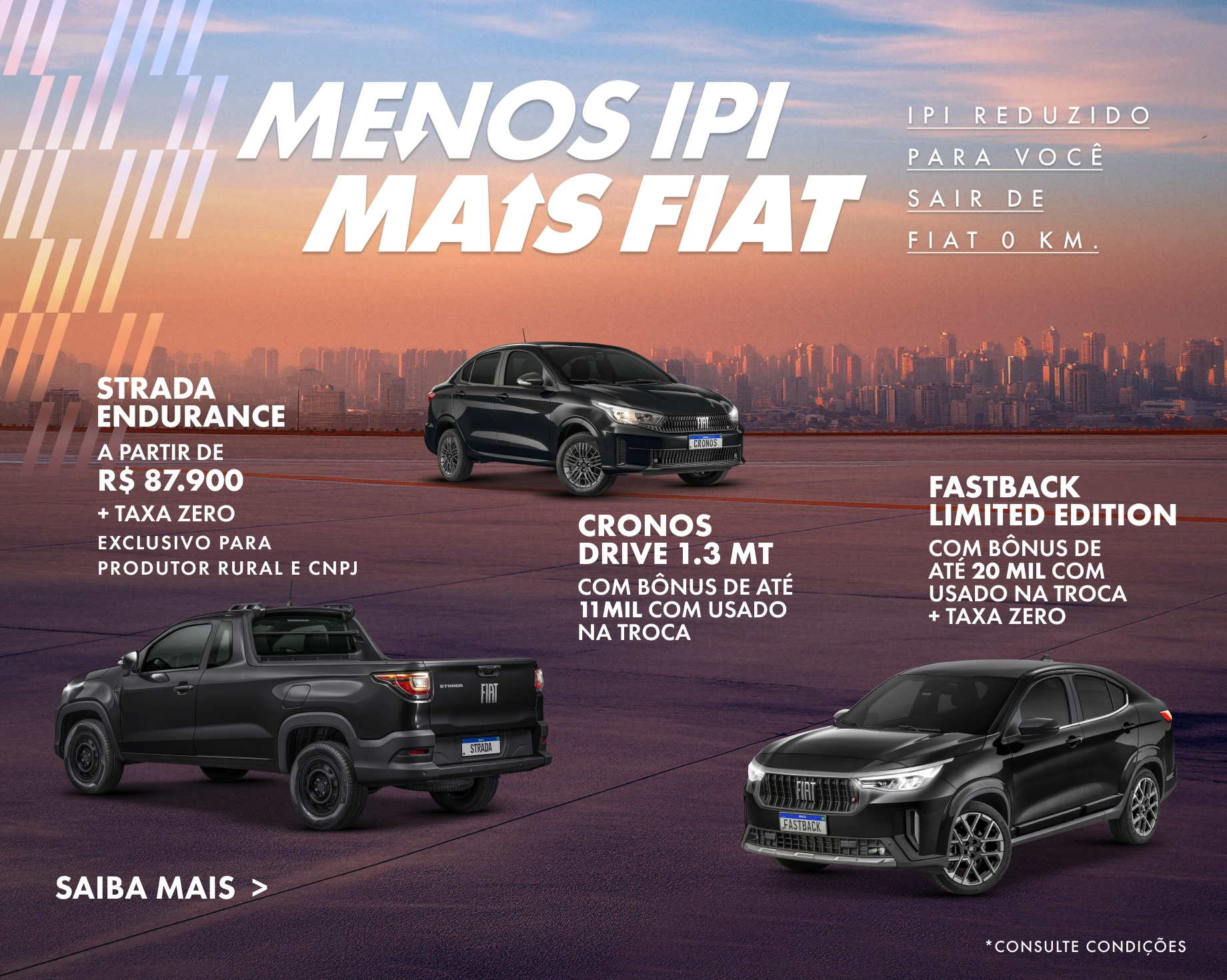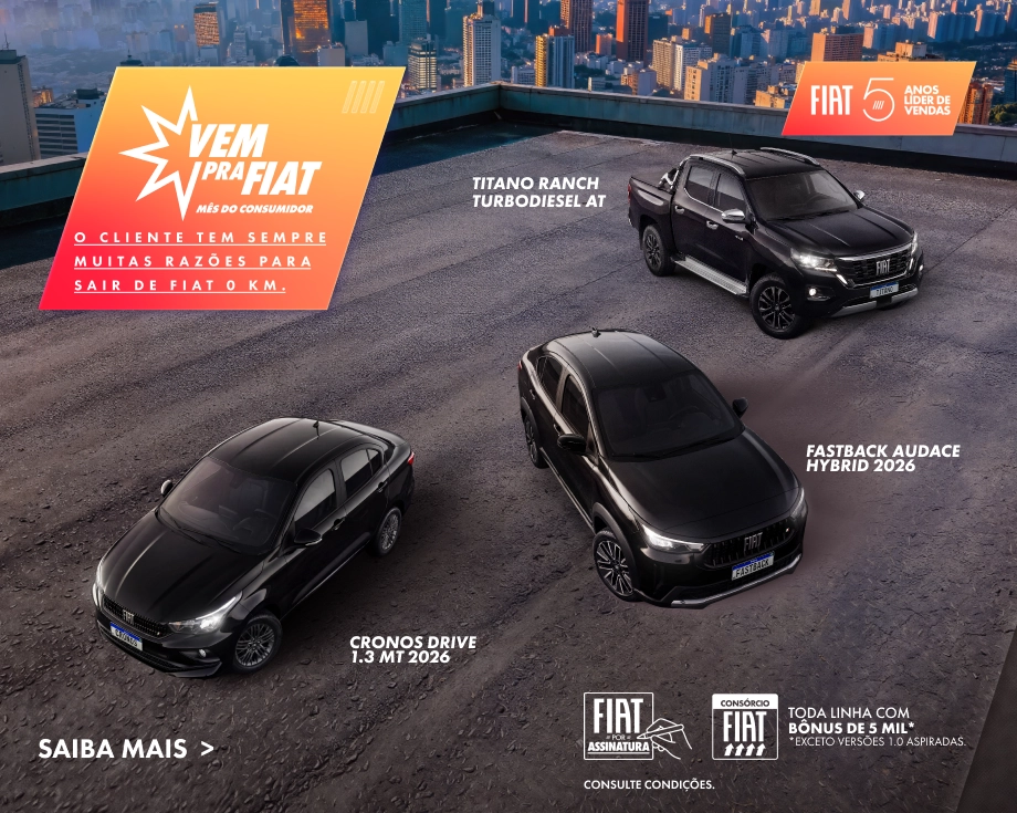 Supervalorização do usado, condição válida para FIAT CRONOS DRIVE 1.3 MT ano/modelo 25/26. A concessionária Fiat participante avaliará, com base em seus exclusivos critérios, o seminovo do cliente, com valorização de até R$9.000 na avaliação, que poderá ser usado como parte do pagamento, com possível adicional de bônus varejo de R$4.000, a depender da avaliação feita pela concessionária. Limitado a 01 (um) veículo seminovo para cada número de chassi do veículo novo. Oferta válida para pessoa física que adquirir, exclusivamente na modalidade varejo, entre o período de 05/03/2026 a 07/04/2026 ou enquanto durar o estoque de 50 unidades nas concessionárias Fiat participantes, prevalecendo o que ocorrer primeiro. Frete incluso. Oferta não cumulativa com outras ofertas vigentes da Stellantis ou da Rede de Concessionárias Fiat. Consulte demais termos e condições junto à uma concessionária da rede Fiat participante. Para mais informações, entre em contato com a central de relacionamento: 0800 707 1000. Desacelere. Seu bem maior é a vida.